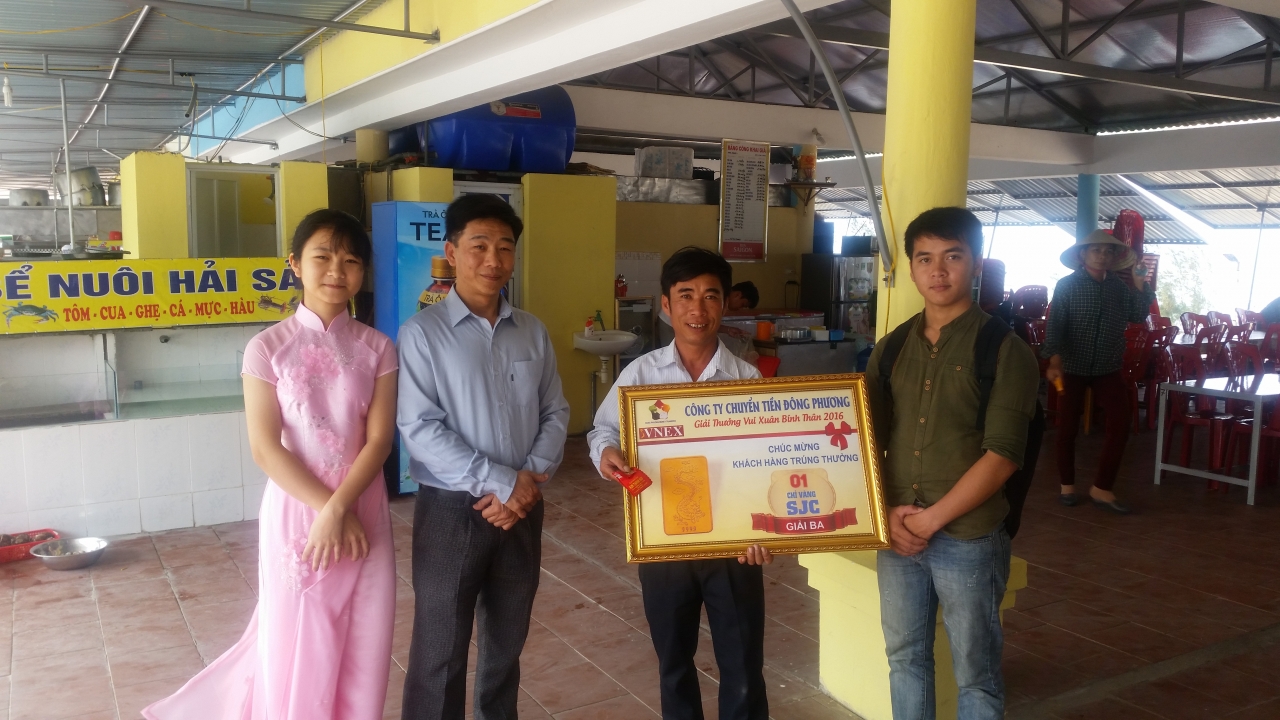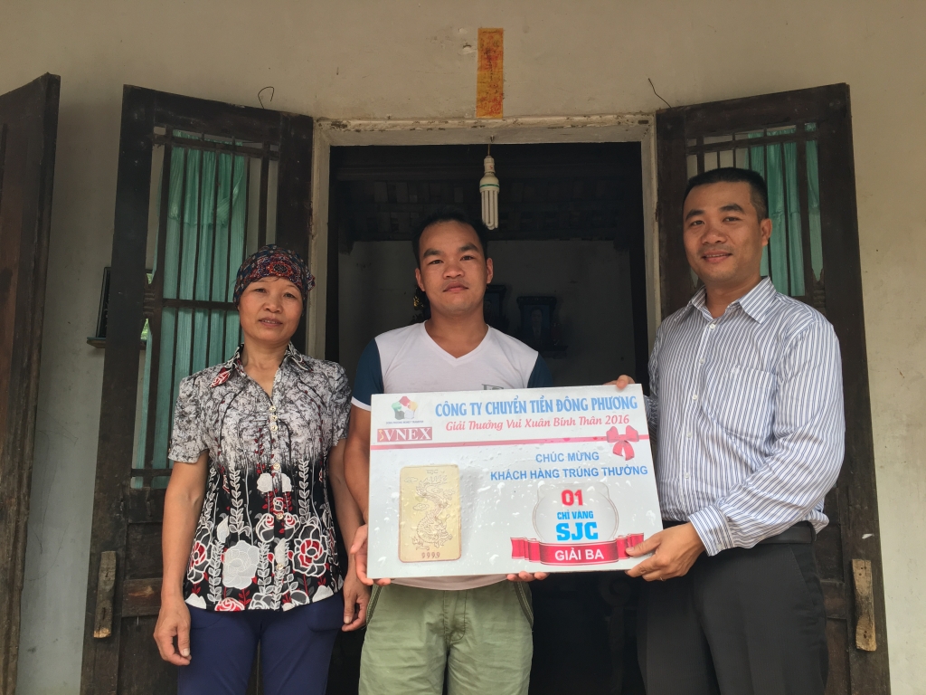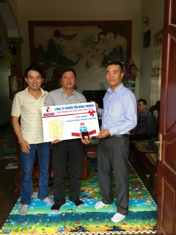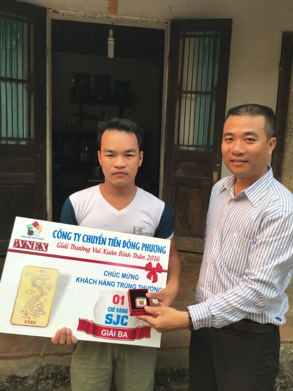 Sáng ngày 16/04/2016, tại Hà Nội, Hà Tỉnh và Hải Dương, Công ty Chuyển Tiền Đông Phương đã tổ chức Lễ trao giải Ba là 01 chỉ vàng SJC từ chương trình “Vui xuân Bính Thân 2016” cho khách hàng trúng thưởng. Chương trình được kết hợp giữa Công ty chuyển tiền EEC-VNEX từ Đài Loan và Công ty chuyển tiền Đông Phương tại Việt Nam.